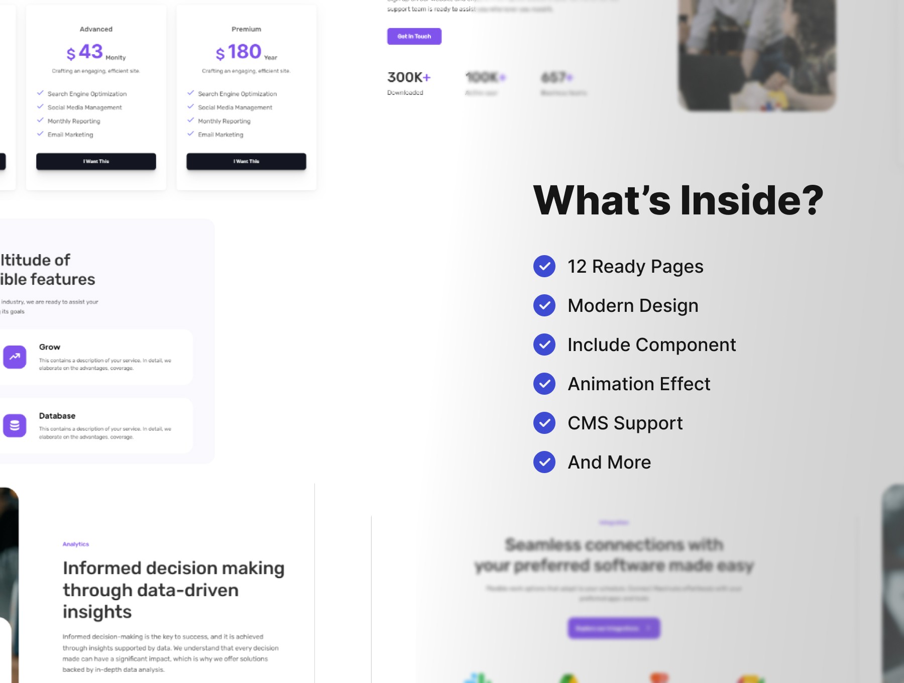 Home, Home 2, About Us, Pricing, Features, Integration, Contact, Blog , Detail Blog(CMS), 404, Term, Privacy